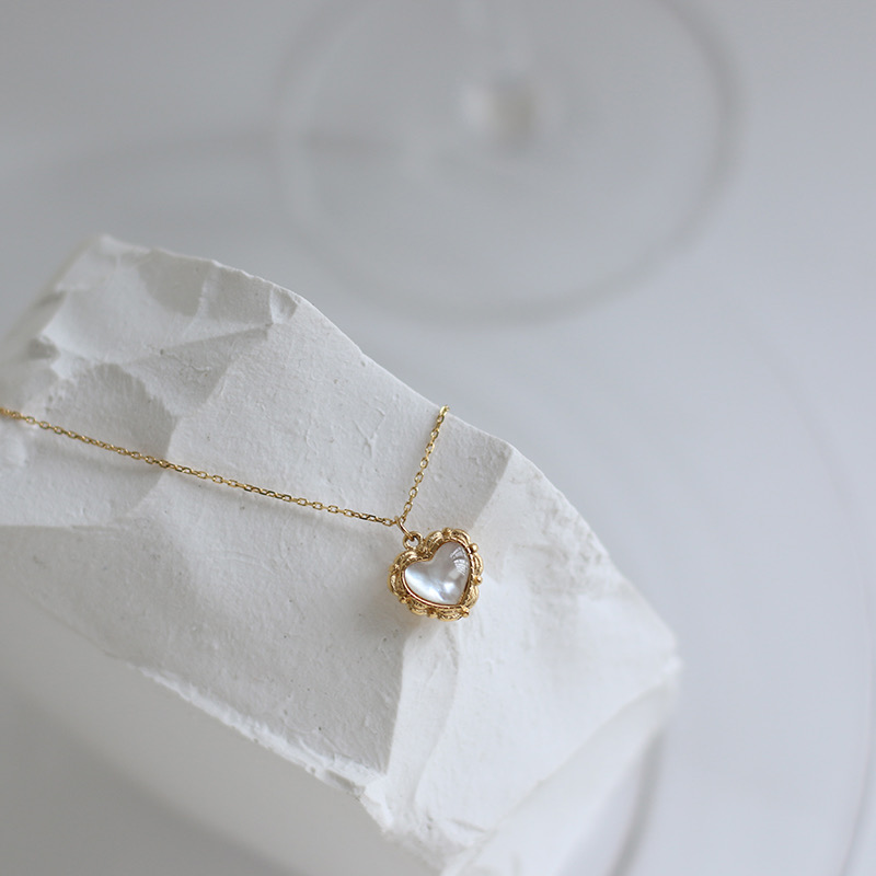 The delicate heart-shaped shell pendant, paired with a sleek gold chain, brings a soft, vintage-inspired touch to your style.